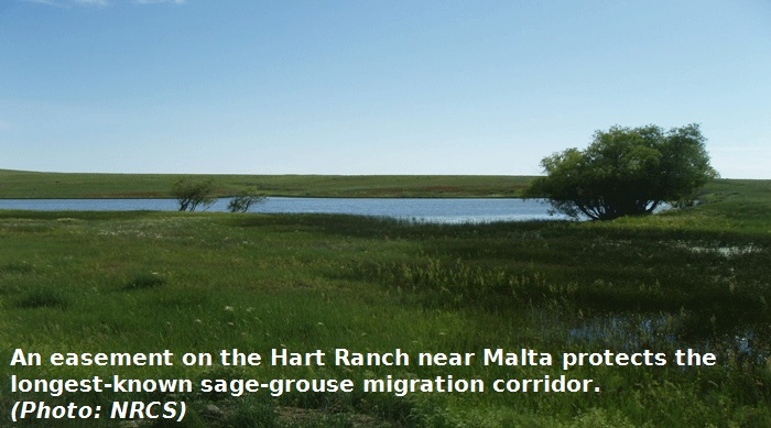 The Hart easement covers 2,434.4 acres of critical sage-grouse habitat on the 3,520-acre Hart Ranch. Easements like this help sage-grouse nest and raise their young in silver sagebrush habitats in Canada, north of the Milk River, before the birds migrate up to 100 miles south to winter in big sagebrush habitats in northern Montana.